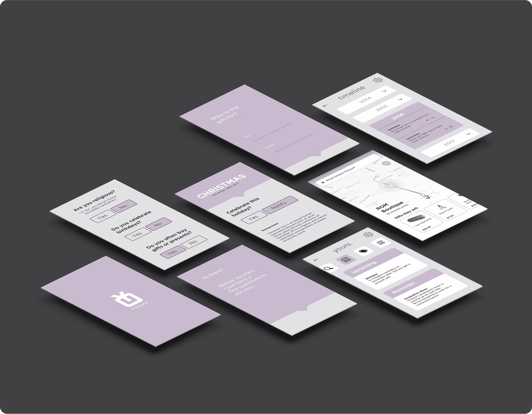 For my third-year design thesis at Centennial College, I conceptualized and designed Yours, a gift recommendation service focused on simplicity and care. The idea was to create a clean, minimal, and approachable experience, carried through everything from the app icon to the interface.